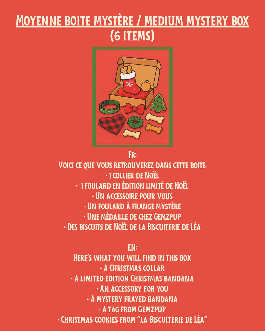 Notre moyenne boite mystère pour chien inclus 6 items. Voir les photos pour plus d'informations sur les produits.