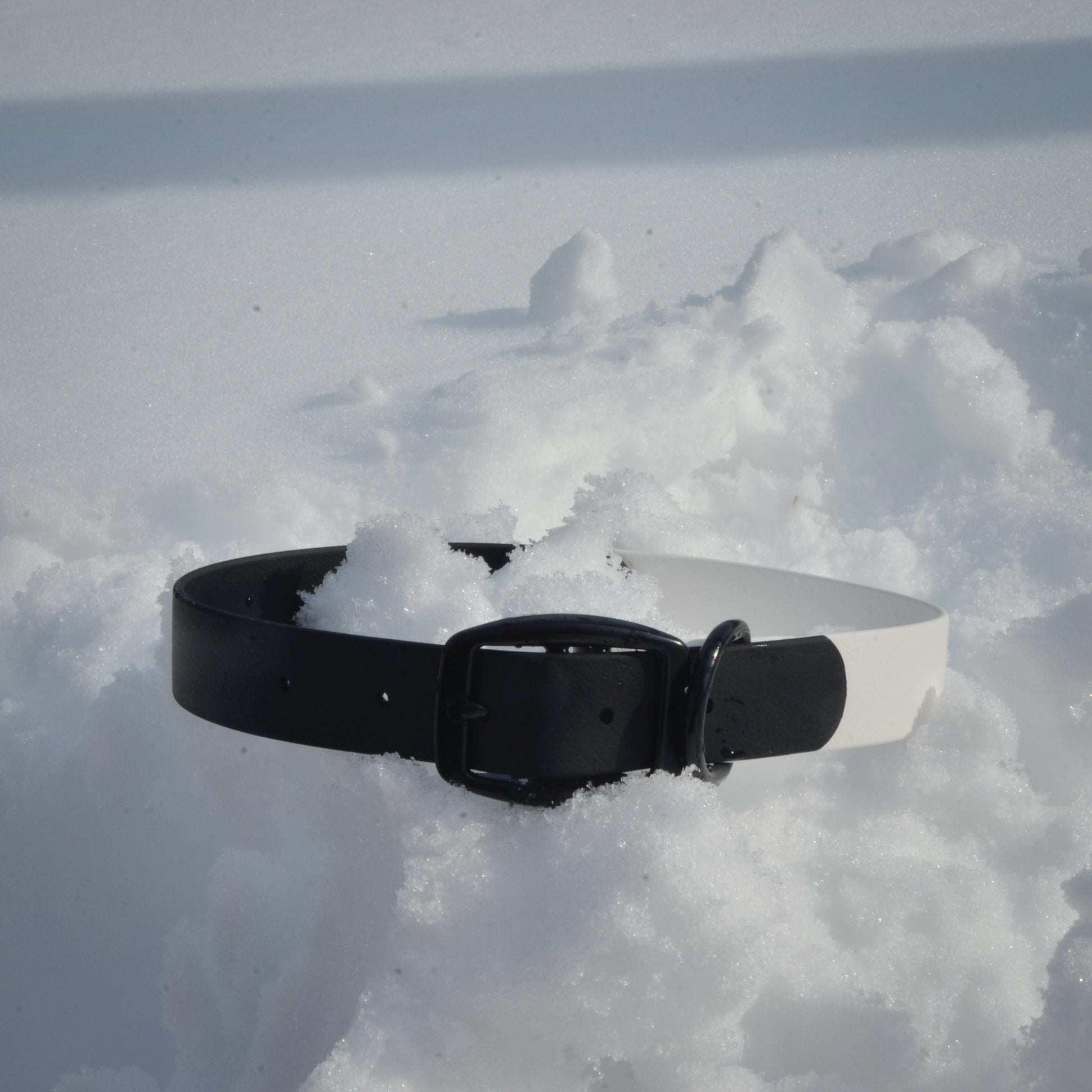 E: Our collars are made in biothane. This material is waterproof, will not absorb odors and will not stain. Biothane is easy to clean, a bit of water and soap and your collar will look new. Our biothane products are handmade in Quebec.