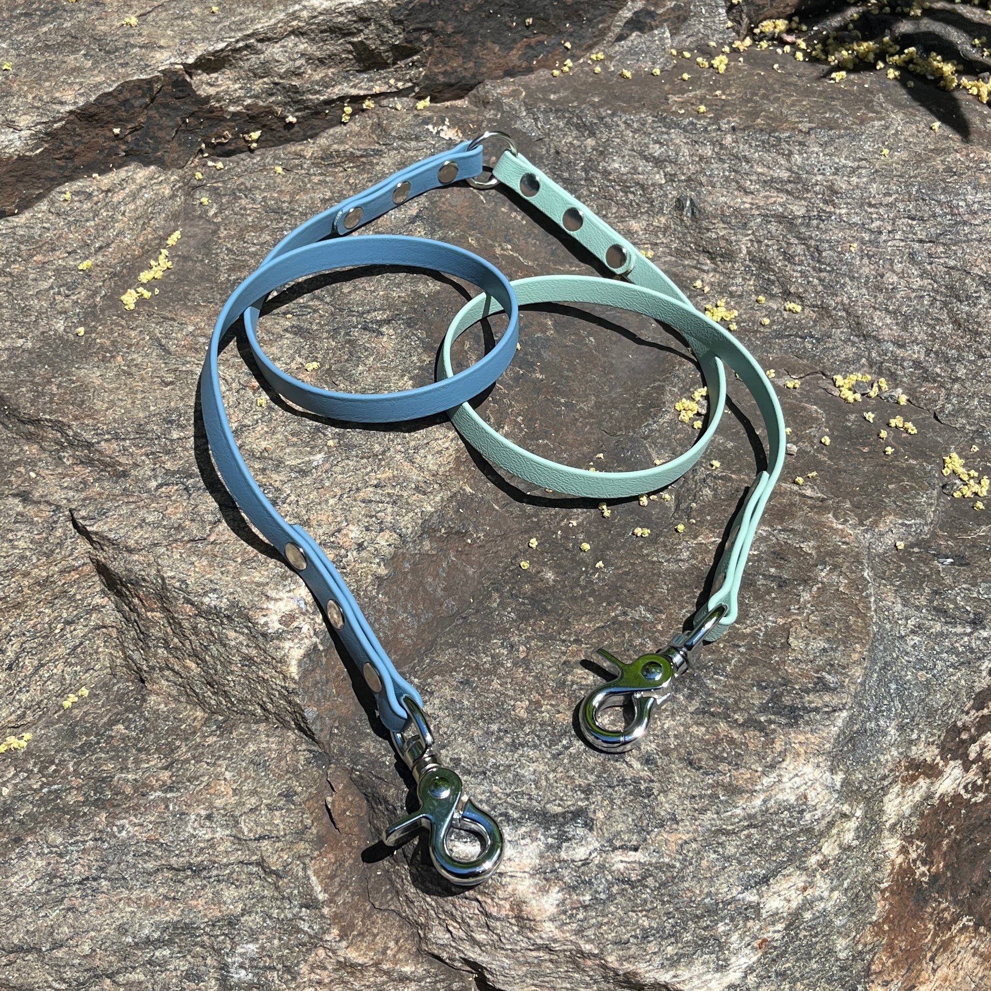 E: Our leashes are made in biothane. This material is waterproof, will not absorb odors and will not stain. Biothane is easy to clean, a bit of water and soap and your leash will look new. Our biothane products are handmade in Quebec.