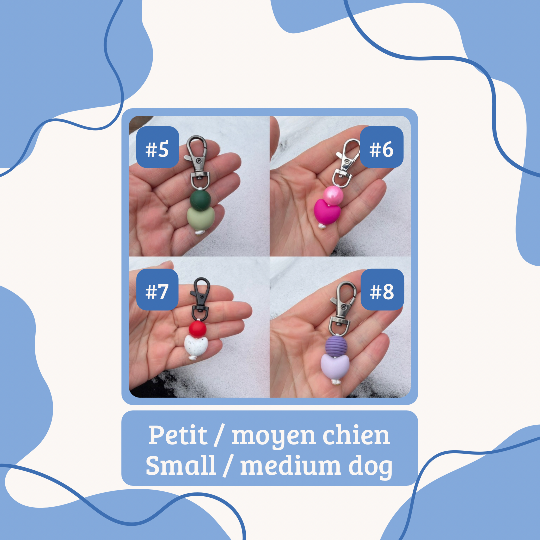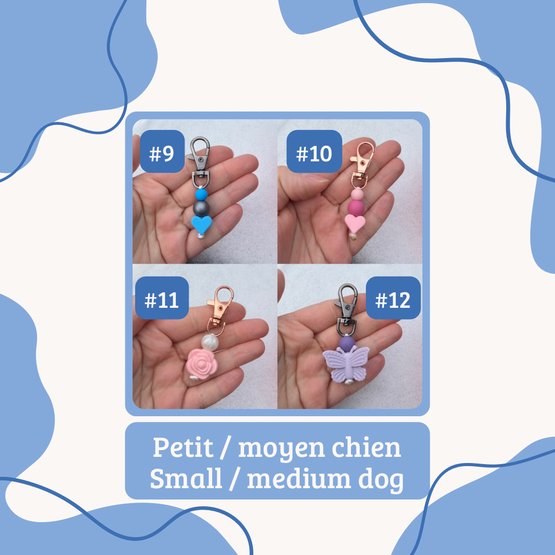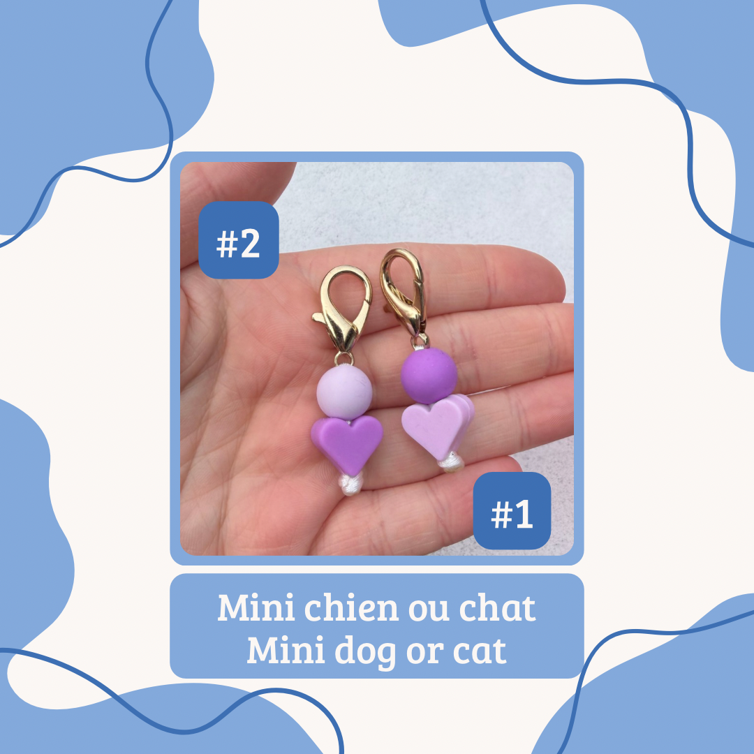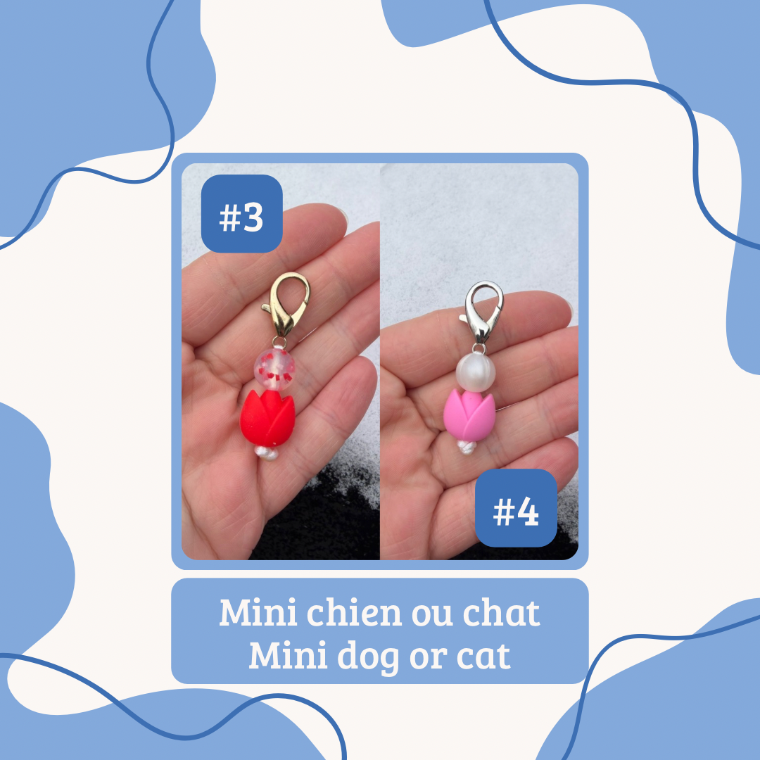 E: Our collar charms are made with silicone beads, sometimes with wooden beads or wooden beads with crochet on it. We do not recommend putting in water or snow the ones with wooden beads. Our collar charms can also serve as a small keychain or a charms for your bags. These are handmade in Quebec.