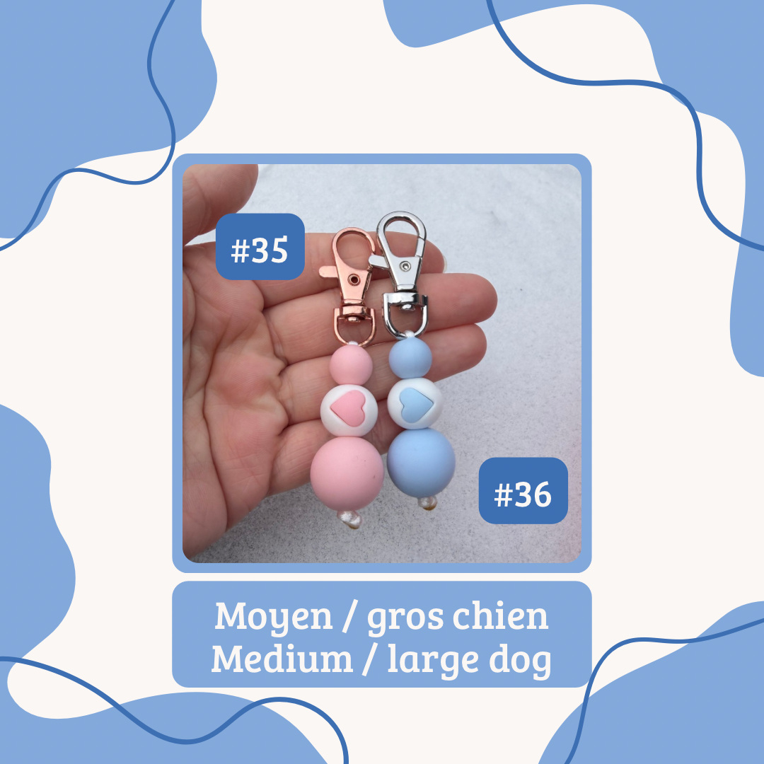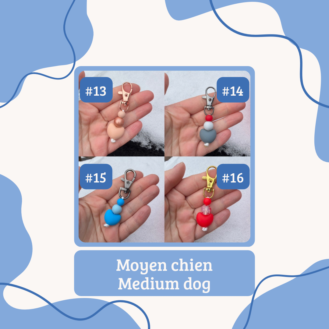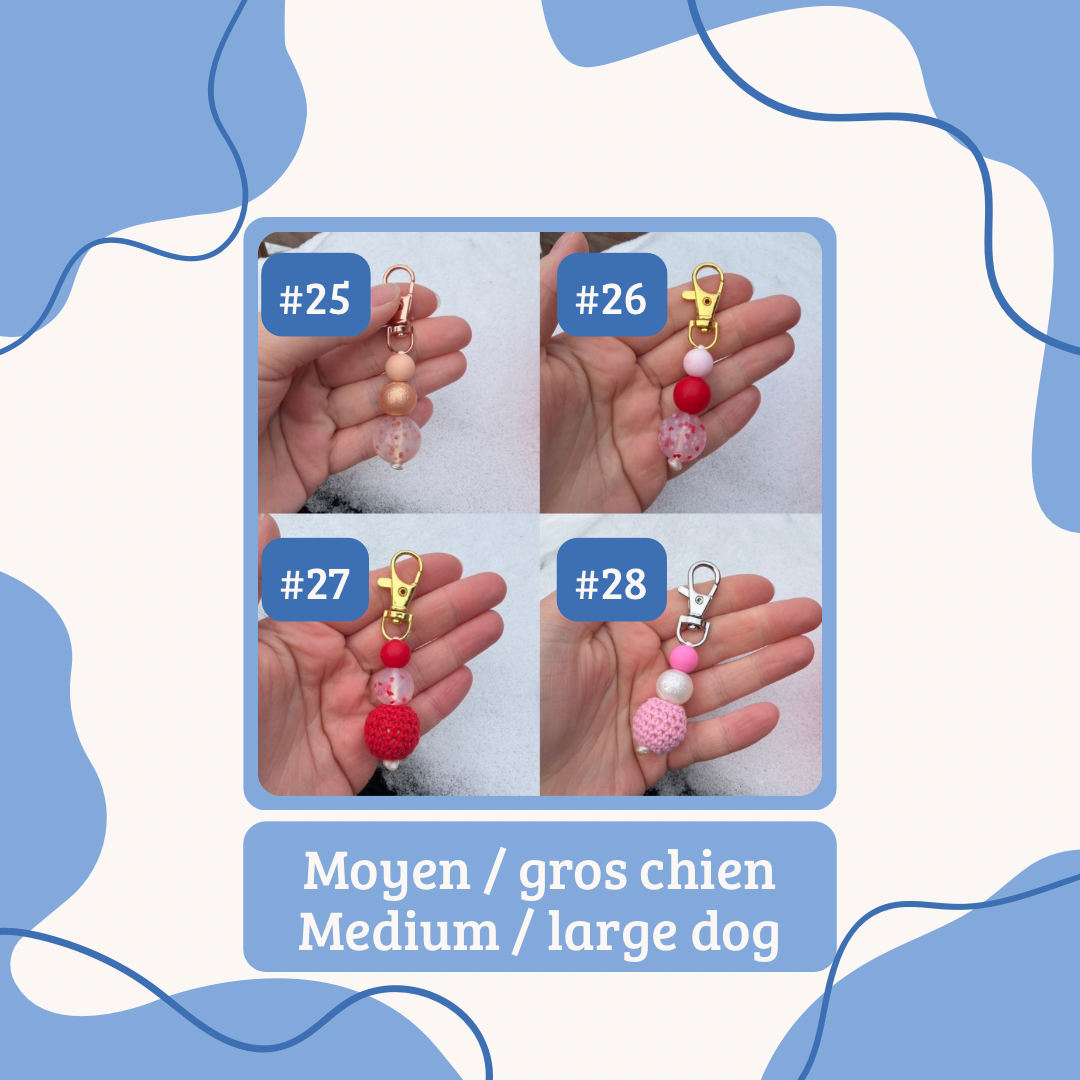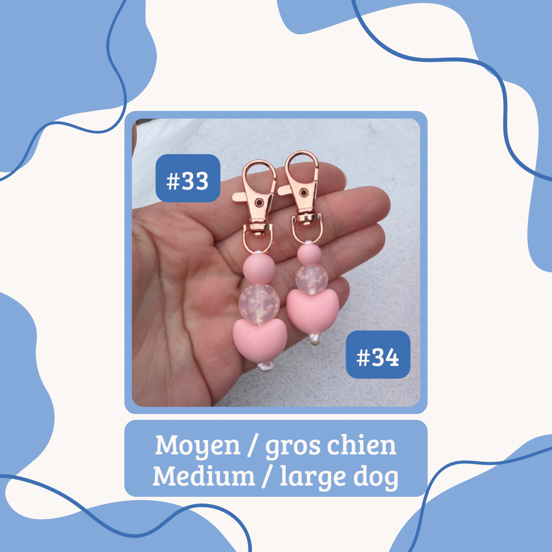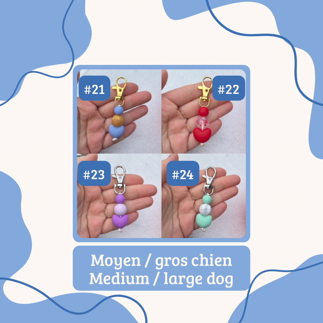 E: Our collar charms are made with silicone beads, sometimes with wooden beads or wooden beads with crochet on it. We do not recommend putting in water or snow the ones with wooden beads. Our collar charms can also serve as a small keychain or a charms for your bags. These are handmade in Quebec.