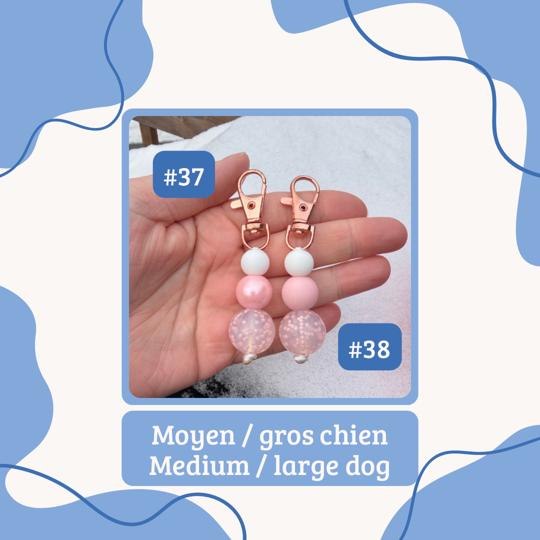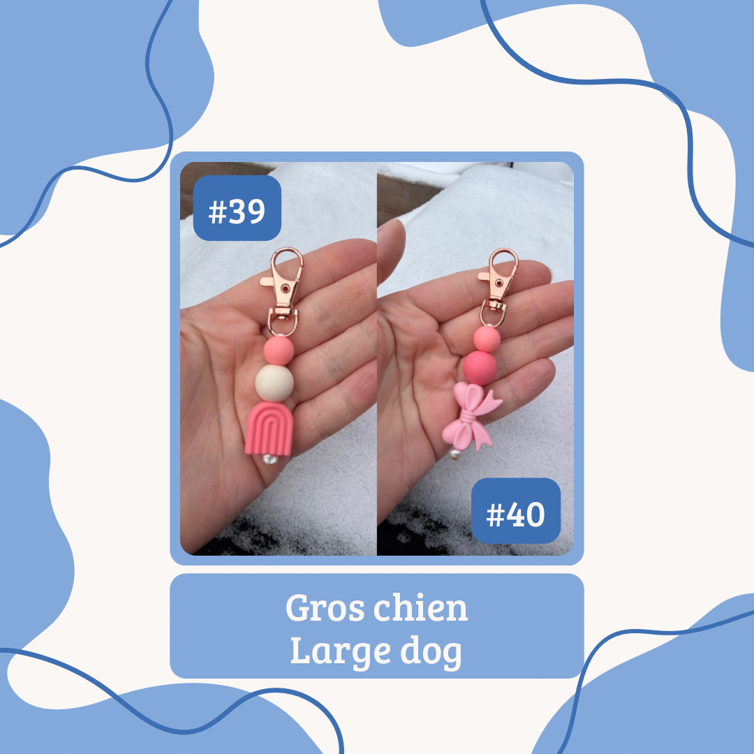 F: Nos breloques à collier sont fabriqué avec des billes en silicones, quelques fois avec des billes de bois ou de bois avec du crochet sur celles-ci. Nous ne recommandons pas de mettre les breloques avec billes de bois dans l'eau ou dans la neige. Nos breloques à collier peuvent également servir de petit porte-clé ou d'accessoire pour vos sacs. Celles-ci sont faite à la main au Québec.