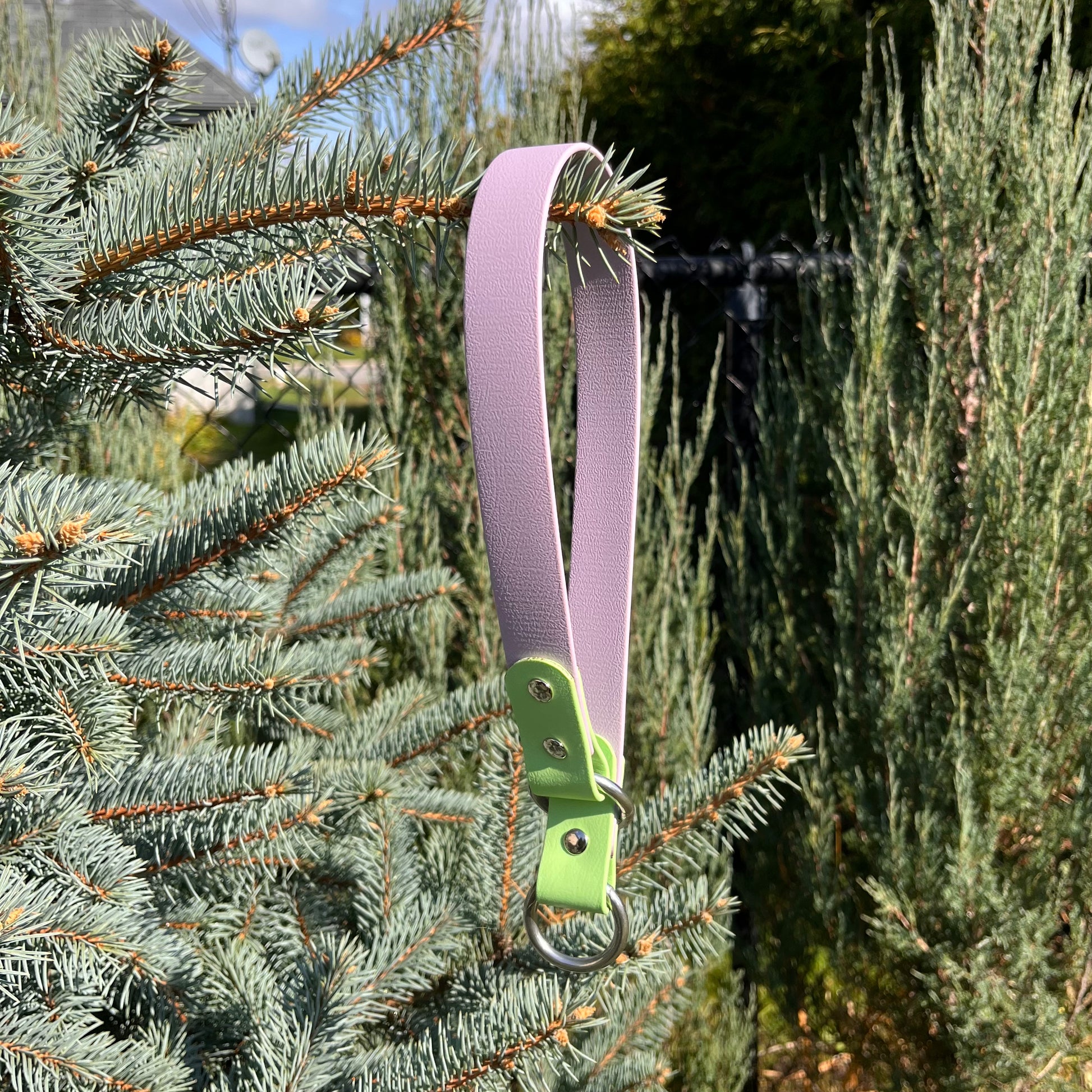 E: Our collars are made in biothane. This material is waterproof, will not absorb odors and will not stain. Biothane is easy to clean, a bit of water and soap and your collar will look new. Our biothane products are handmade in Quebec.