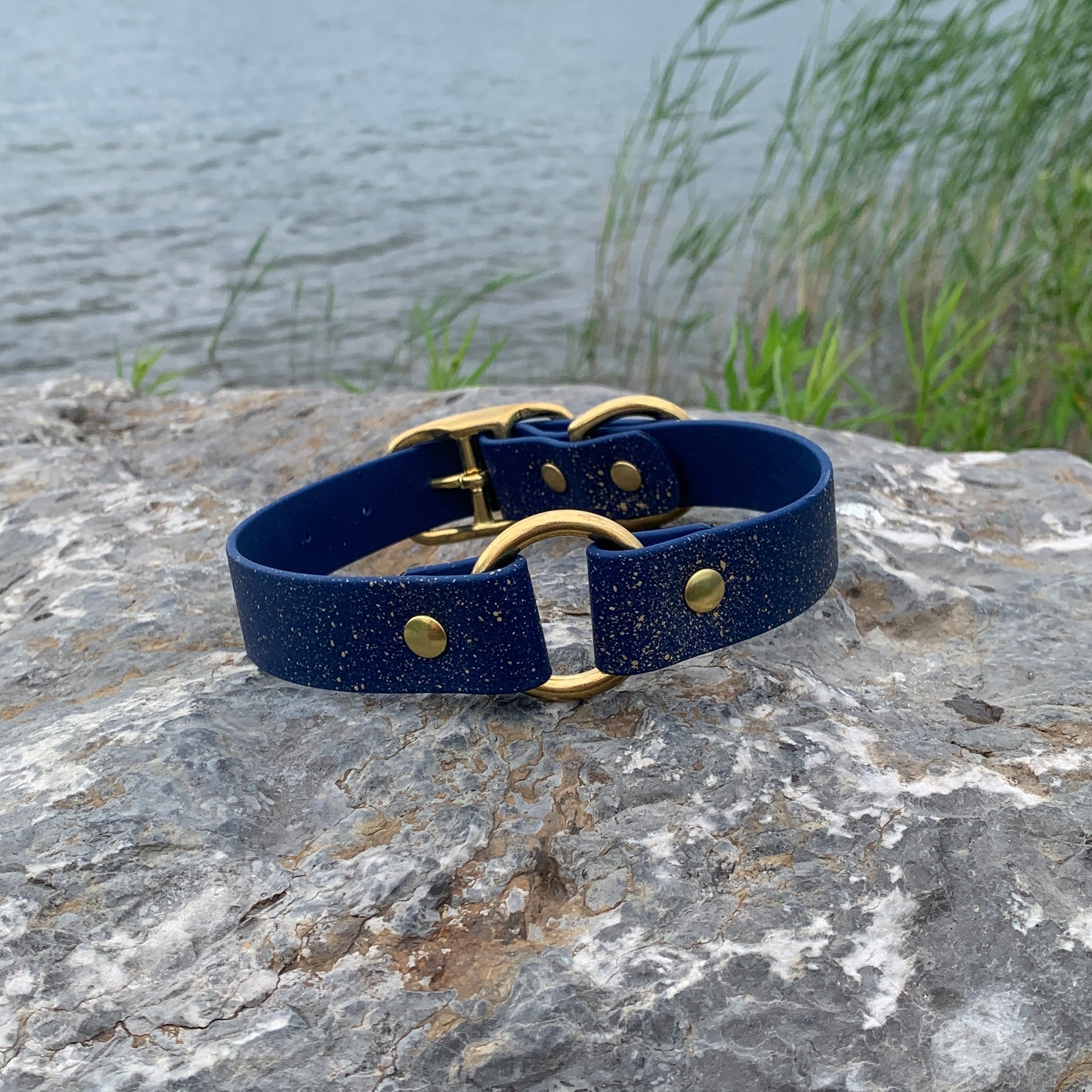 The paint used for our speckled collars is waterproof and will not crack or peel. It is normal for the paint to come off where the collar buckle is.