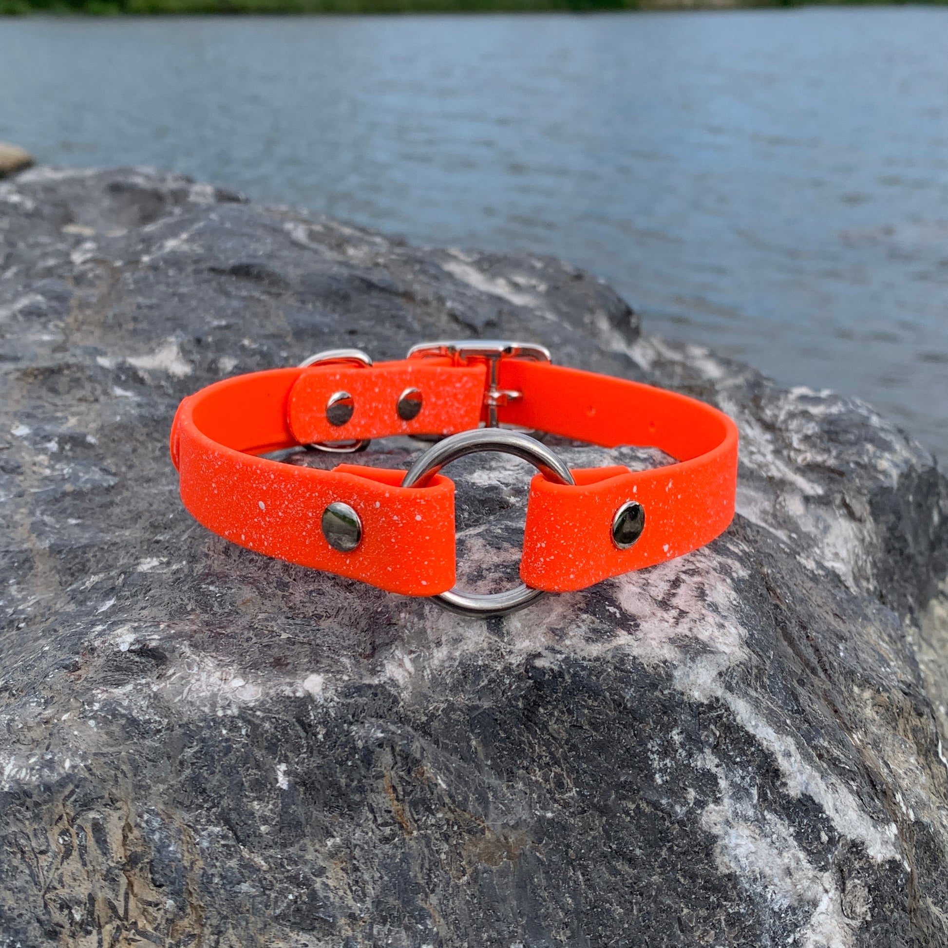 E: Our collars are made in biothane, this material is waterproof, will not absorb odors and will not stain. Biothane is easy to clean, a bit of water and soap and your collar will look brand new. Our biothane products are handmade in Quebec.