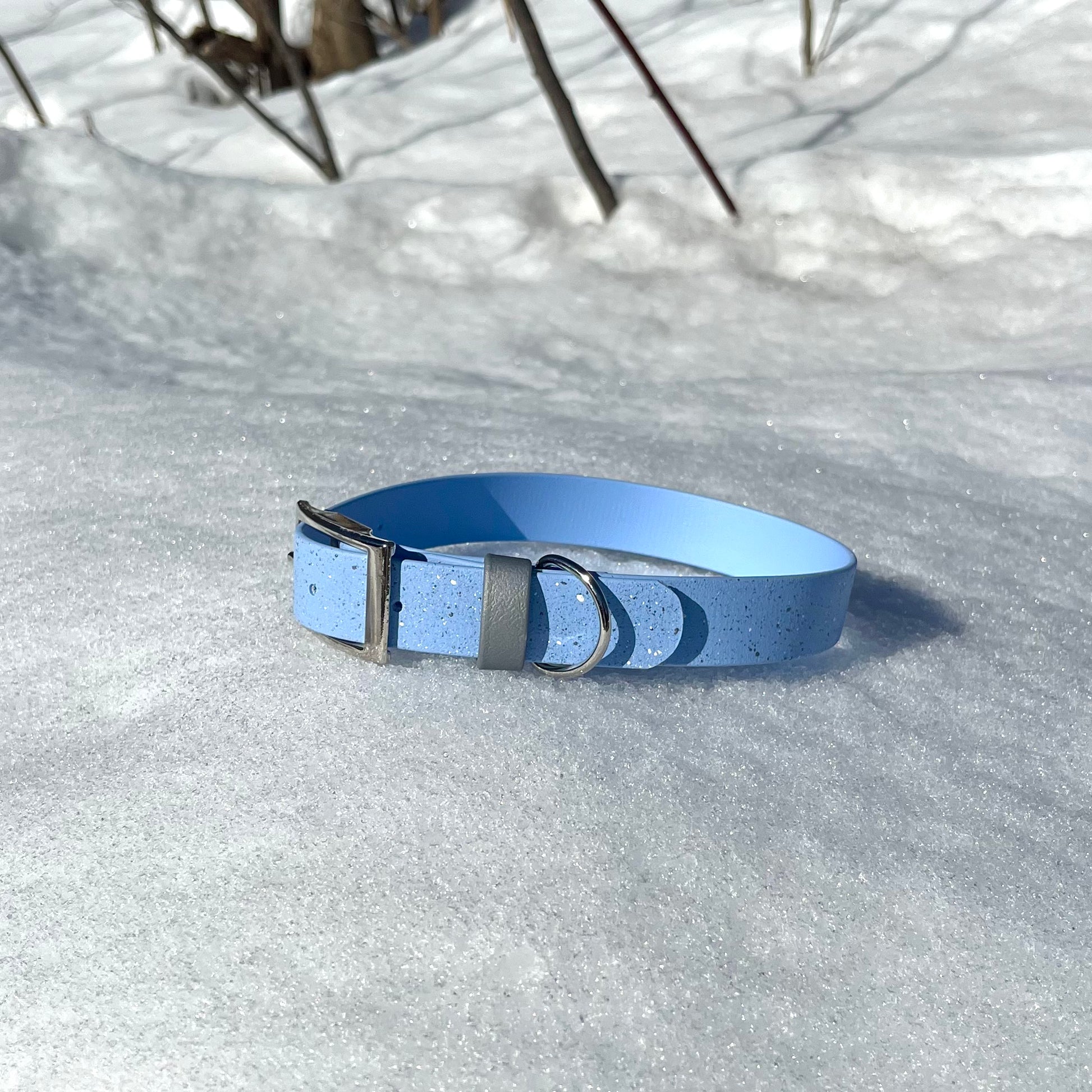 The paint used for our speckled collars is waterproof and will not crack or peel. It is normal for the paint to come off where the collar buckle is.