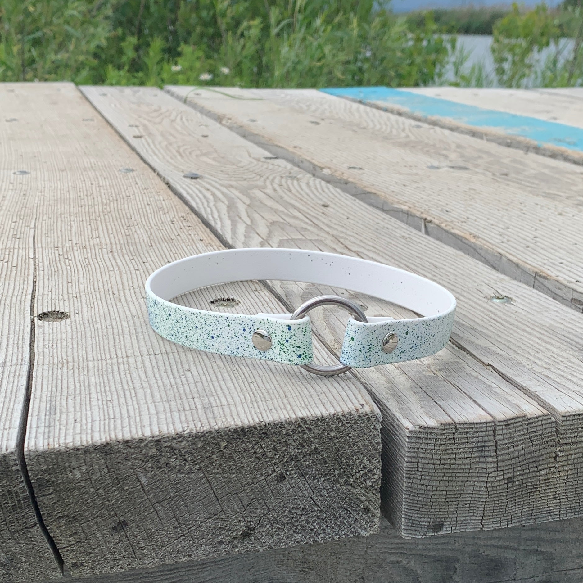 The paint used for our speckled collars is waterproof and will not crack or peel. It is normal for the paint to come off where the collar buckle is.