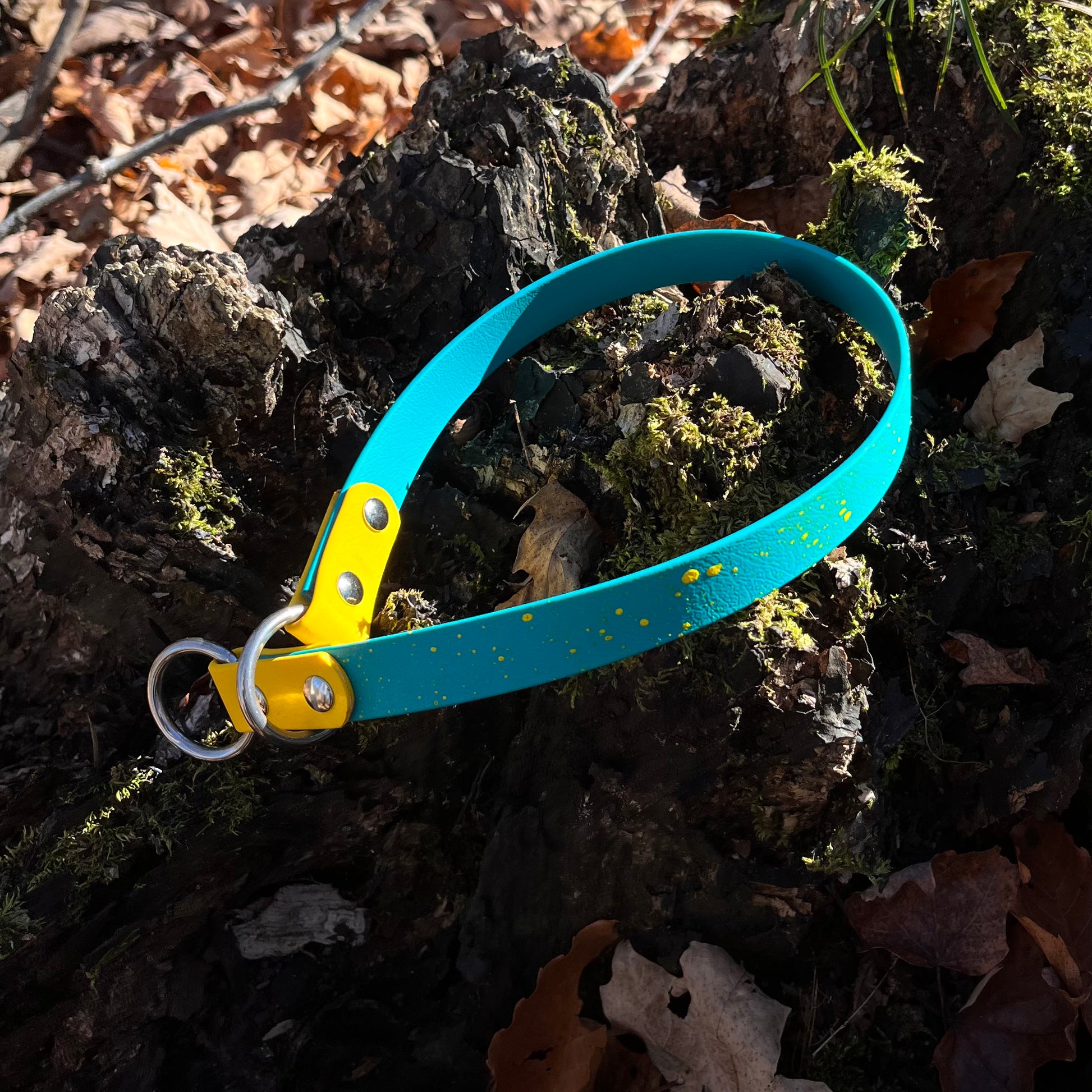 E: Our collars are made in biothane, this material is waterproof, will not absorb odors and will not stain. Biothane is easy to clean, a bit of water and soap and your collar will look brand new. Our biothane products are handmade in Quebec.